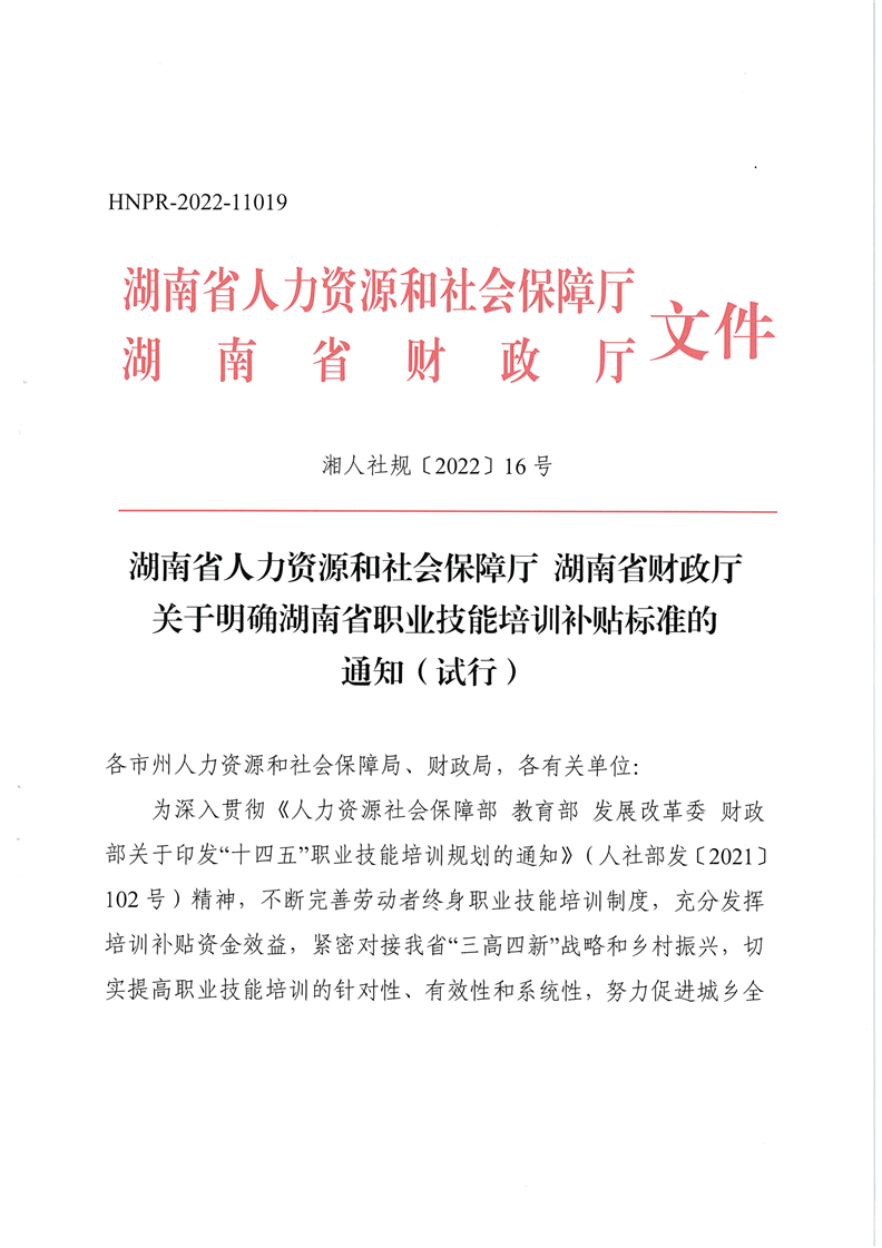 转发 湖南省人力资源和社会保障厅 湖南省财政厅关于明确湖南省职业技能培训补贴标准的通知(试行)