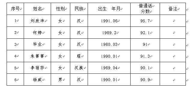 各位专兼职教师: 按照湖南省《关于举办湖南省第第42期省级普通话水平测试员资格考核培训班》(湘语测函〔2018〕11号)精神,教务处在教学院部认真推荐的基础上,组织专家进行遴选,决定派刘欣沛等6位教师,参加第42期省级普通话水平测试员培训,并择优推送国家级普通话水平测试员培训。现将名单公示如下: