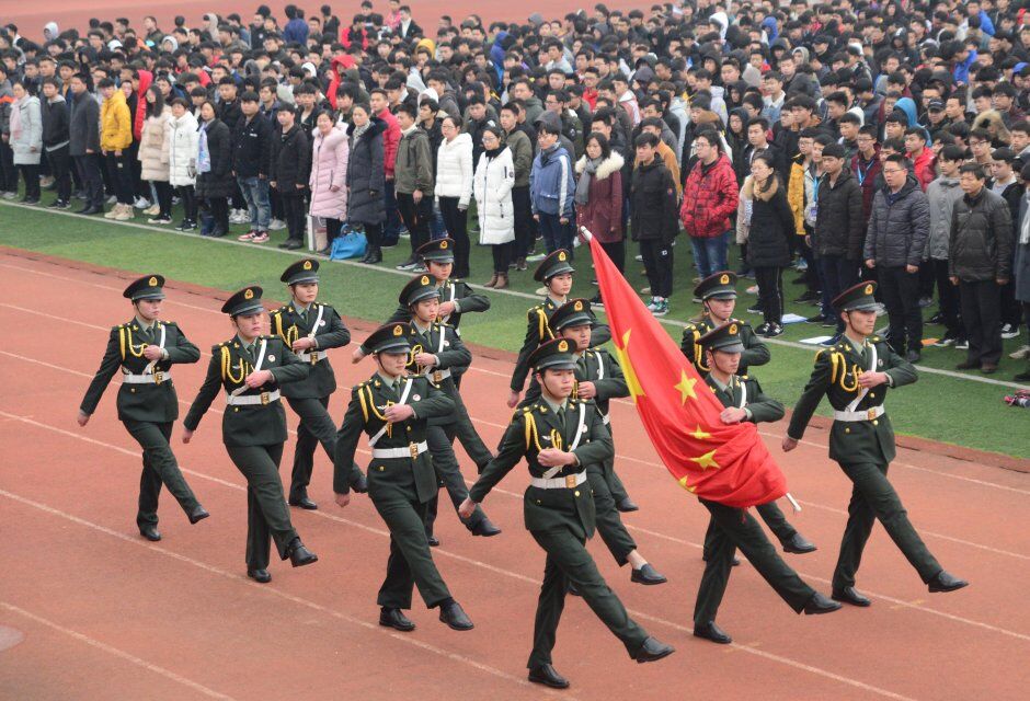 伴随着一丝丝凉风,护旗班迈着矫健的步伐,将国旗护送至升旗台下。在庄严的国歌声中,全体师生肃立,向冉冉升起的国旗行注目礼。
