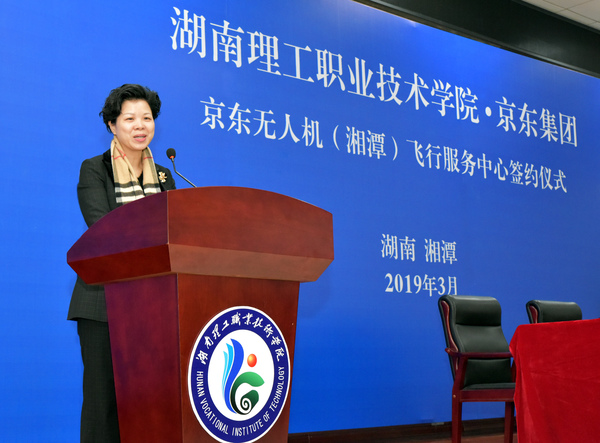 张迎春对我校与京东集团再次签约,深入开展校企合作表示热烈祝贺。她指出,京东集团自去年正式入驻湘潭以来,加速了电商、物流的业务拓展和产业布局。此次,京东集团与理工职院合作京东无人机(湘潭)飞行服务中心项目,极具战略眼光,极具发展前景,必将抢占电商行业发展的新高地”,她衷心希望京东集团能够以此次校企合作为契机,进一步发挥人才、技术、平台等方面优势,在“互联网+”方面加强与湘潭的合作,为湘潭经济发展注入“科技基因”、“创新血液”的强大动力。