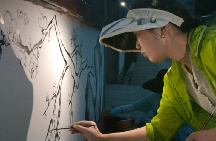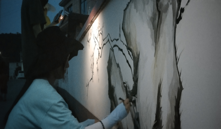 老师从测量墙面、定绘制稿、定墙面位置、绘制线稿到基本上色以及细节调整等几个流程进行现场教学和指导,学生们相互合作,配合默契。创造过程不仅仅是对学生们专业技能的检验,也是对其体能意志的考验。所有成员以画笔颜料为工具,以空白墙面为载体,创作出了多幅精美的墙绘作品,为乡村美化贡献智慧和才华的同时自身也收获满满。