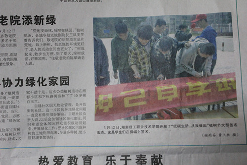 3月13日湘潭日报:理工职院开展“低碳生活,从我做起”植树节大型签名活动