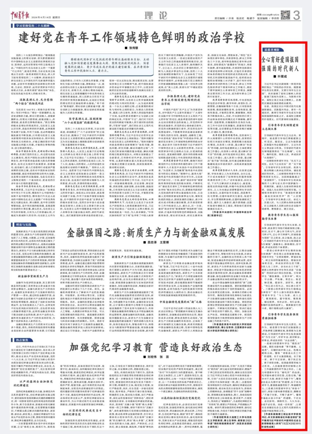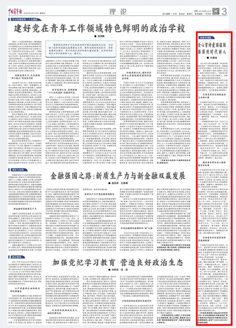 当前,我国正在以中国式现代化推进强国建设、民族复兴伟业,青年一代正逢其时,教育引导青年学生成长为爱国报国强国的栋梁之才,是高校立德树人的价值要义、时代要领和实践要旨。