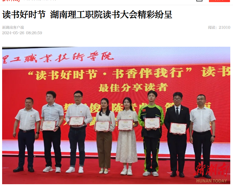湖南日报·新湖南客户端5月26日讯(通讯员 周娜 朱菁菁)近日,湖南理工职业技术学院举行第十四届读书月——“读书好时节·书香伴我行”读书大会。校党委书记叶星成,校长李科及全体党委班子成员、教职工和学生代表共300余人参加本次活动。