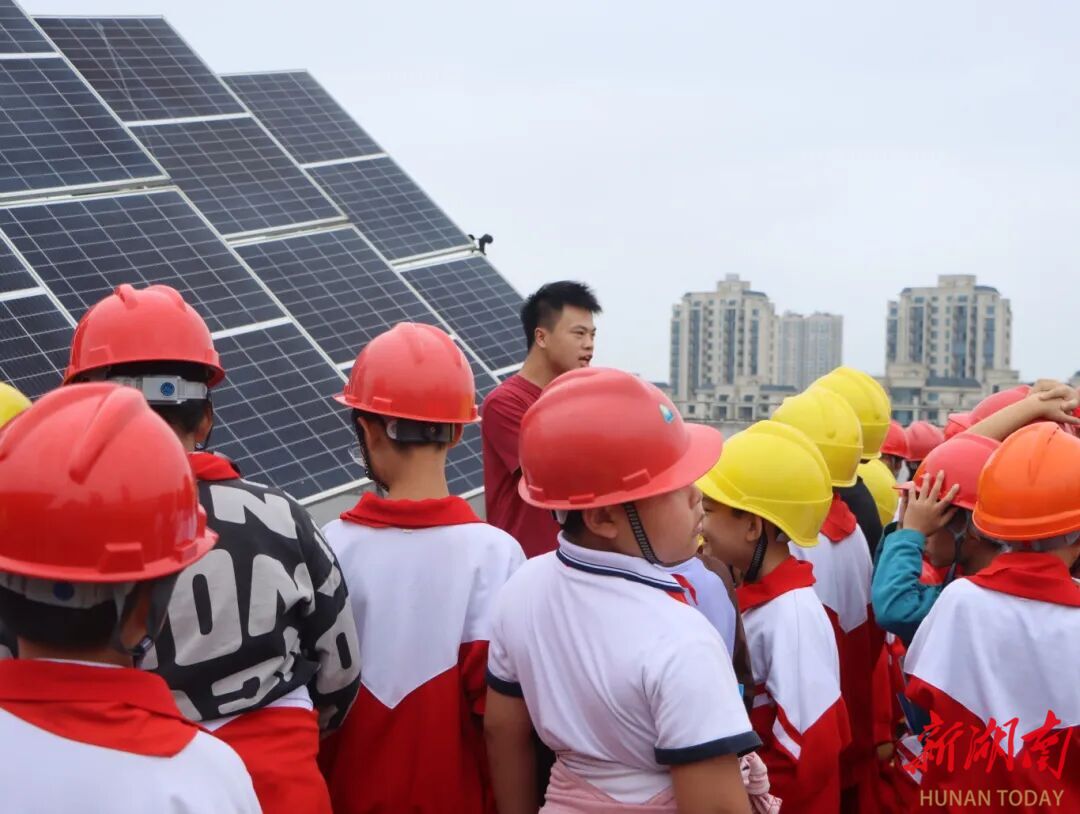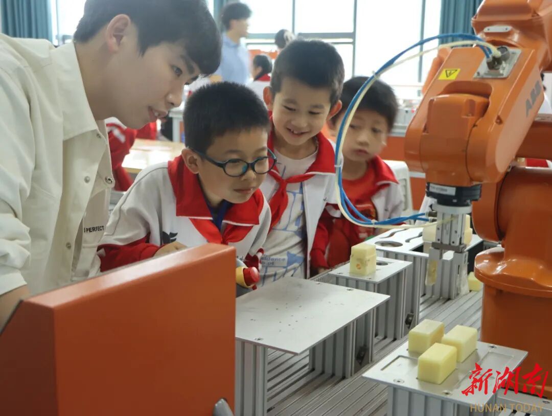 在此背景下,湖南理工职院承办了全国科普月湖南分会场系列活动之一——“青春铸就匠心 创新引未来”主题开放日活动,湘纺小学320余名师生走进大学校园,亲身体验科技魅力。当天,湘纺小学师生依次参观了太阳能科技馆、新能源大楼风光互补实训室、无人机实训室、工业机器人实训室、屋顶跟踪式光伏电站等场地。在这场科技探索之旅中,学生们分组体验各实训场所,在师生志愿者带领下亲手操作工业机器人、体验无人机飞行,真实感受“阳光变电能”“风能助发电”等绿色能源技术的神奇魅力。