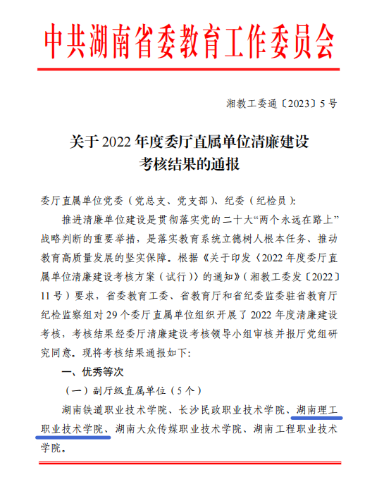 近日,省教育工委发布《关于 2022 年度委厅直属单位清廉建设考核结果的通报》湘教工委通〔2023〕5号,经驻省教育厅纪检监察组实地考察考核,湖南理工职业技术学院获评优秀等次。