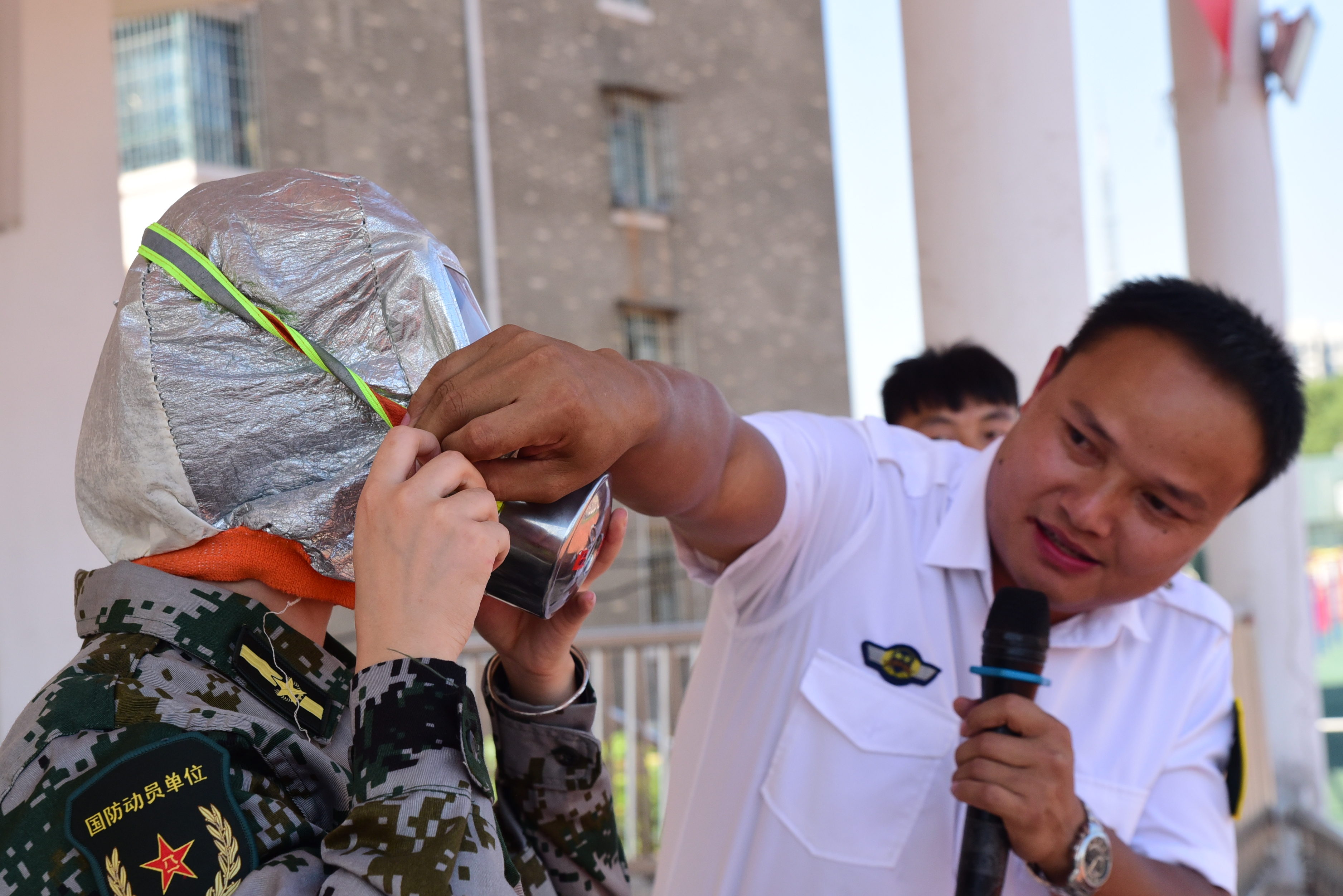 在培训环节,吴德亮为在场师生进行了消防安全知识培训。他先后讲解了火灾预防常识及发生火灾时和火场逃生过程中的注意事项,并就如何报火警、如何扑灭初起火灾以及火场上如何正确自救互救等内容进行了重点宣讲。详细讲解了防毒面具的正确操作方式,以及灭火、逃生演练,并实地演练了灭火器的使用方法、如何手持灭火器进行灭火等。