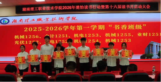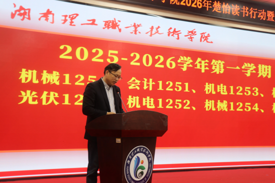 ▲何瑛作了题为《书香浸润理工 阅读照耀青春》的动员报告,并宣布“湖南理工职业技术学院2026年楚怡读书行动暨第十六届读书月”正式启动。