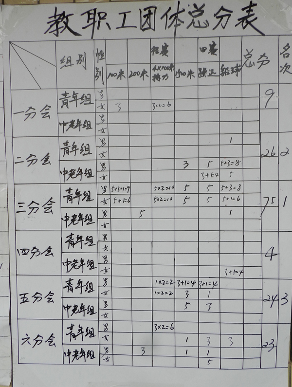 本届教职工田径运动会,分青年男、女组和中老年男、女组,共参加了:100米、200米、1500米、4×100米跑步和跳远、铅球等六个项目的比赛。在比赛中,各工会分会根据比赛赛程安排认真组织参赛队员积极参与,参赛的教职工也发扬“更高、更快、更强”的奥林匹克精神,团结协作,顽强拼搏,赛出了风格、赛出了水平、也赛出了友谊。最后,校工会第三分会、二分会、五分会分别获得了本届职工田径运动会前三名。