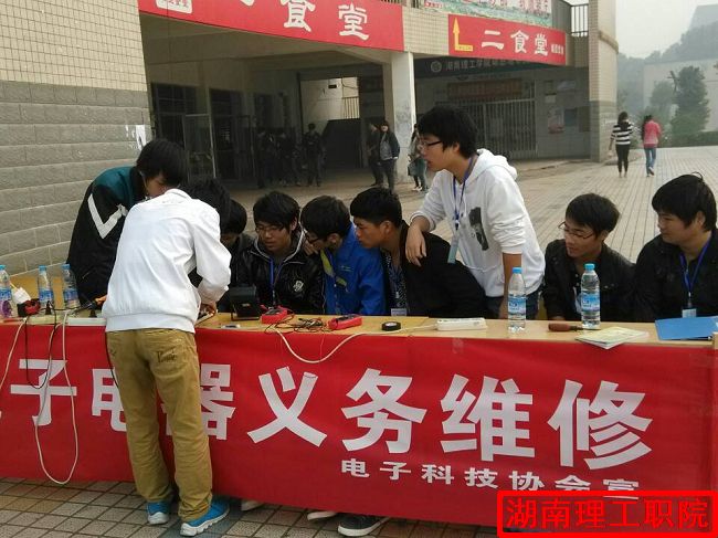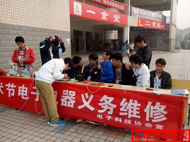 为积极开展社团文化艺术节,大力提高当代大学生的动手能力与技能,湖南理工职业技术学院电子科技协会于11月24日在食堂前坪组织开展电器义务维修活动。