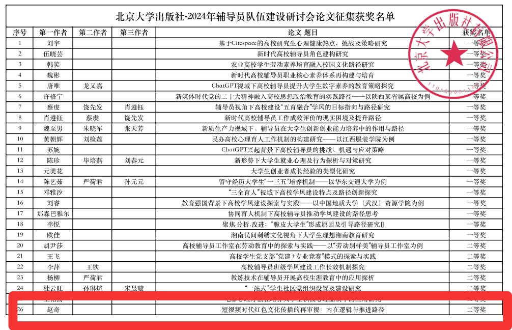 研讨会设置了主题征文活动,全国各高校辅导员积极参与,主办方收到论文 245 篇,按时提交参奖论文 188 篇。经评委组多方面评选,共评出获奖论文 113 篇,其中一等奖 19 篇、二等奖 38 篇、三等奖 56 篇。我校智能制造学院党总支副书记赵奇老师所撰写的《短视频时代红色文化传播的再审视:内在逻辑与推进路径》荣获二等奖。