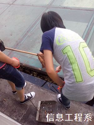 (图为学生整在三教三楼雨棚边缘清理烟头等垃圾)