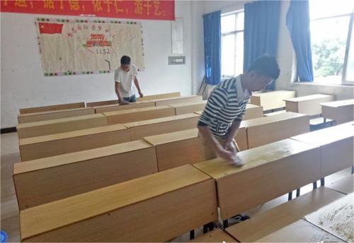 下午14:00,集合完毕后,志愿者带上钢丝球、抹布和橡皮擦等劳动工具,开始对我院教室的课桌以及“牛皮癣”进行清理。虽然天气闷热,但50多名志愿者们个个精神饱满,斗志昂扬,始终干劲十足,同时在清洁的过程中也充分体现了他们不怕脏、不怕累的优良品质,并培育了同学们的劳动观念和奉献精神。在擦拭教室课桌上面的字迹时,有的时隔已久不能完全清理干净,这让志愿者们意识到以后绝不能在课桌上乱涂乱画,并要以此告诫身边的同学拒绝课桌涂鸦。