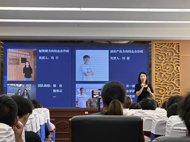 在介绍“双引擎培养模式”时,专业负责人重点展示了专业的师资力量、实训条件及校企合作资源,指出将通过“校内教学+企业实践”双路径助力学生成长,并鼓励大家把握数字时尚产业发展机遇,不断提升专业能力。