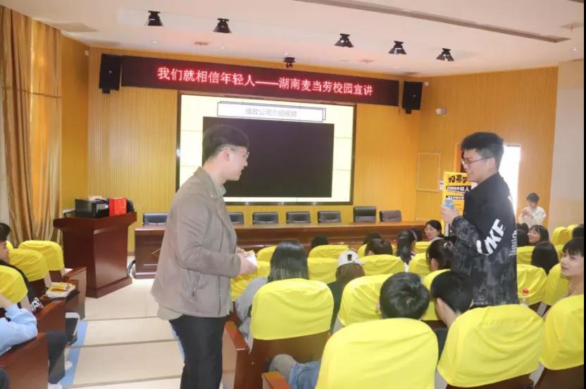 肖赵杰向现场同学展示了麦当劳精心制作的宣传视频,帮助同学们更加直观地了解到麦当劳企业文化,并为同学们介绍了企业文化、薪资体系、食宿补贴、招聘岗位等多个方面,让同学们更加了解到麦当劳企业的情况。肖赵杰在现场通过提问与同学们进行了有趣的互动,同时和同学们分享了许多小故事,为其今后找工作带来了很多的启示。