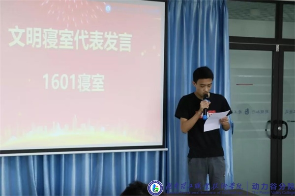 文明寝室代表1601寝室长机电1175班袁旭彪发言:没有完美的个人,只有完美的团体。一个优秀的寝室,离不开寝室成员良好的卫生习惯。日常生活中,室友间要团结友爱,彼此尊重、互相帮助,营造和谐融洽的室友关系,发现不足,及时改正。