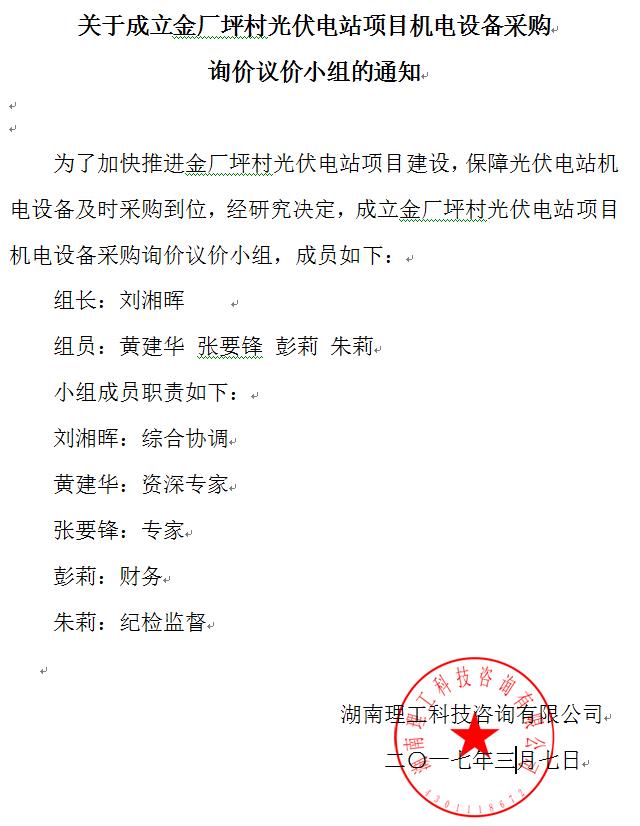 关于成立金厂坪村光伏电站项目机电设备采购询价议价小组的通知