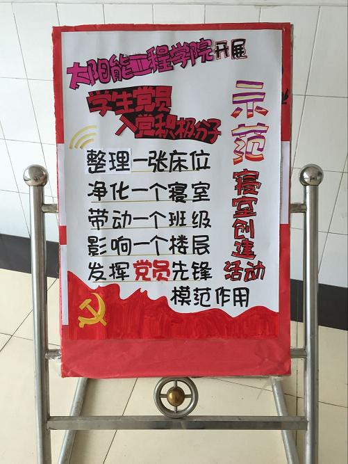 为开拓学生寝室管理工作的新局面,努力营造和谐的学习和生活环境,充分发挥学生党员在宿舍文化建设中的先锋模范作用,我院决定在入党积极分子、学生党员(预备党员)中开展“示范寝室”创建活动。